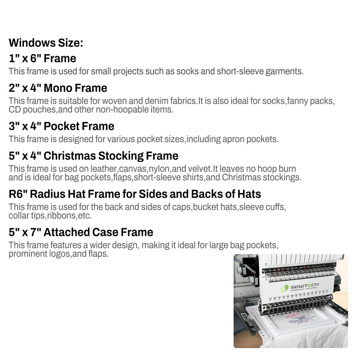 A2: Sewtalent 6 in 1 magnetic hoop fits in sleeves, socks, cap, bags, sheets, flags, normal fabric, leather embroidery item, if you work on these items, you are suggested to buy one.