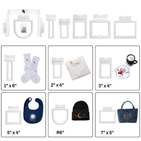 With the 6-in-1 embroidery hoops magnetic set, you can easily switch between six hoop sizes to suit different embroidery needs and fabric types, including socks, shorts, pockets, bags, and T-shirts.