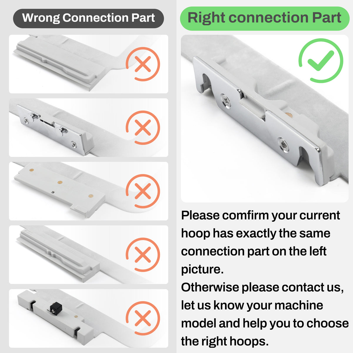Note: The connection parts on these hoops are pegs, these hoops only works with the compatible embroidery machines’ slot connection part.
