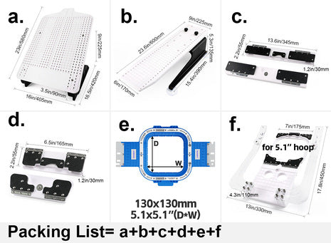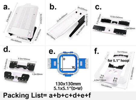 • part e: 5.1″ fixture (which can be used Sewtalent 5.1″ magnetic hoops)